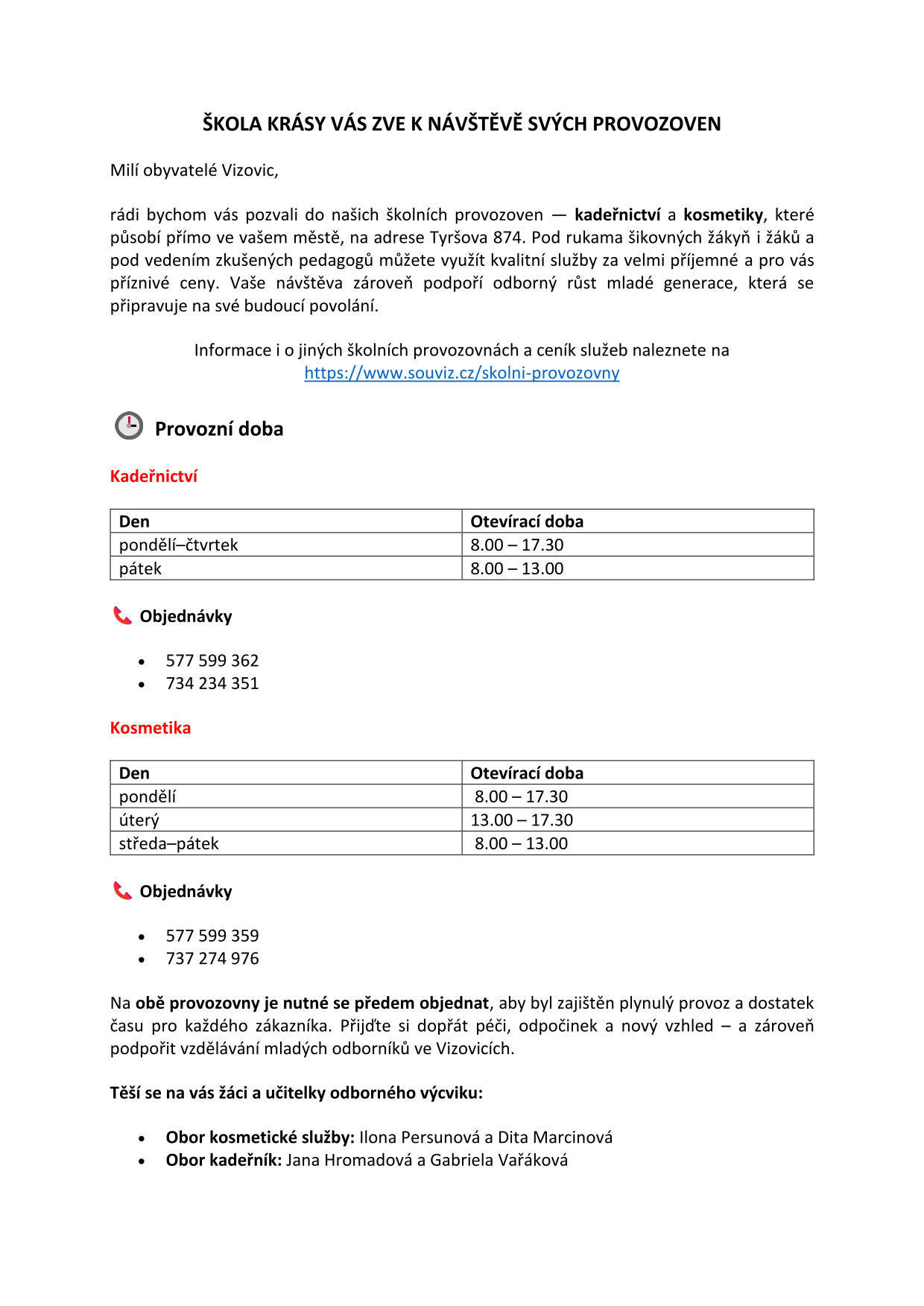 Kromě teoretického vyučování získávají studenti i praktické zkušenosti, zúčastňují se soutěží a své služby nabízejí také veřejnosti, což ne všichni Vizovjané vědí. I vy se tak můžete svěřit do jejich péče. Možná, že jim stříhání, barvení fotografování či jiná služba včetně šití oblečení budou trvat o trošku déle než zkušeným profesionálům, toto však jistě vynahradí velmi příznivá cena, kterou za jejich práci zaplatíte.
